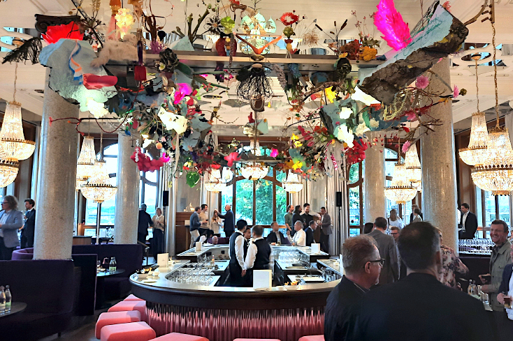 The enlarged, glowing wine crystals pay homage to the good wine of the house. An old vine takes its inspiration from the basilisk. A cosmic egg explosion, sparkling ice cube rain and the set of dentures on a rabbit’s ear become drinking companions. From the guest book of Les Trois Rois, signatures from prominent guests can be discovered in the floating kitchen: Marc Chagall and Mireille Mathieu, the Prince of Ethiopia and the Prince of Königsberg. And then there is the salt: shiny, towering and bright. Until the first half of the 19th century, the city’s salt stocks were stored in the ‘Salzturm’, believed to have been built in the 11th century. After 1702, the then innkeeper of the Three Kings was given permission to expand his inn toward the salt tower, embedding his beams into its masonry. Salt was a precious commodity that also served as currency. Coin mushrooms and a threatening mace of money remind us that the Cantonal Bank of Basel erected the building – echoed today in the name Banks. This hanging garden is also a declaration of love to Basel. It is toned in the wings of the basilisk, a bouquet of test tubes, a micro- scope flower for chemistry. And once again, allusions arise to the Basel ‘Totentanz’, an iconic representation of transience that was destroyed in 1805 and which Gerda Steiner & Jörg Lenzlinger already engaged with in 2016 through an extraordinary total installation in 2016 near the hotel. At Les Trois Rois one encounters a bone bonsai, or the shoulder blades of a wild boar, marked by